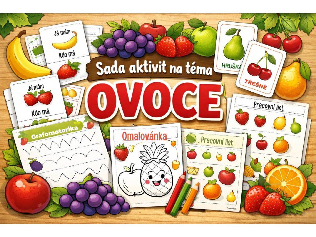 Tato tematická sada na téma ovoce přináší pestrou kombinaci her, pracovních listů a kreativních aktivit, které děti nejen zabaví, ale také rozvíjí důležité dovednosti.